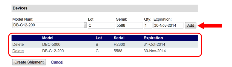 Step 4: When all devices/products have been entered for a shipment, click the “Add” button. That item will appear directly below the selection area (outlined in red in Figure 3 below).