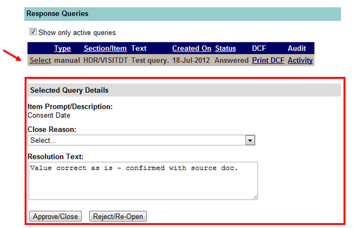 c) Select a “Close Reason” (e.g. no source document; not measured; correct as is; corrected value; self evident correction; sponsor misinterpreted; logic changed; or other) then click either “Approve/Close”, or “Reject/Re-open”. The resolution text may be updated at this time to provide additional clarification if necessary.