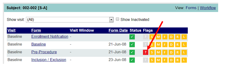 Some queries are automatically generated during the data entry/completion process when data meets pre-programmed criteria/logic [AUTO queries], others are added during the review process [MANUAL queries]. Queries are identified with red query flags which are visible in (and accessible from) the Subject Landing Page (see Figure 1 below) as well as from within the CRF (next to the specific data point as seen in Figure 2 below).