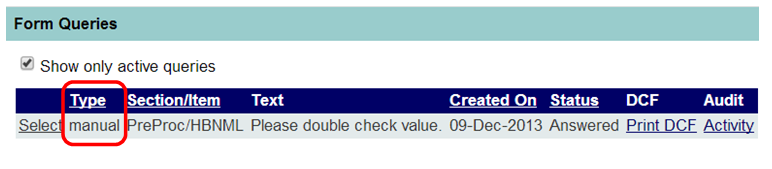 The user is also able to see if the query was auto or manually generated by clicking on the red flag associated with a CRF while in the Subject Landing Page. The screen shown in Figure 3 appears showing the Type of query/ies associated with the CRF. In this instance, the query shown was generated manually.