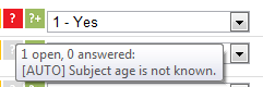 If the Original user interface was selected in user settings, the user may view the issue by hovering over the red flag with a mouse while in CRF view (as shown in Figure 2 above). The bubble text shown below indicates that there is one open query and no answered queries on this field. The query was auto-generated [AUTO] as opposed to having been manually created. In addition, the text of this query is provided.