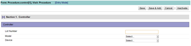 Step 1: Navigate to the Procedure/Treatment Case Report Form (or applicable CRF where the device information is accessed). This CRF is accessed from the Collect Module, Site Name, Subject and Form hyperlinks. Find that portion of the CRF that applies to the recording of product/devices. That portion may be similar in appearance to the section shown in Figure 1 below, but is customized for each clinical trial.
