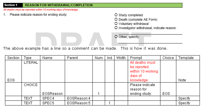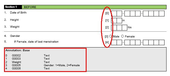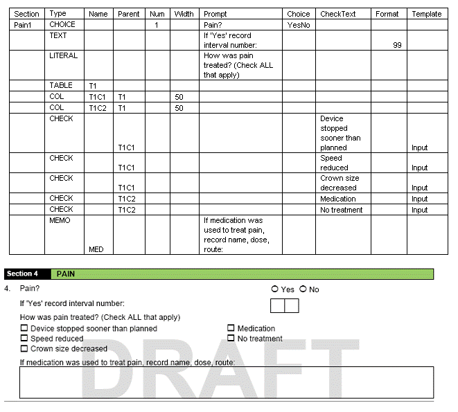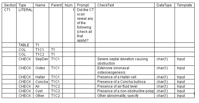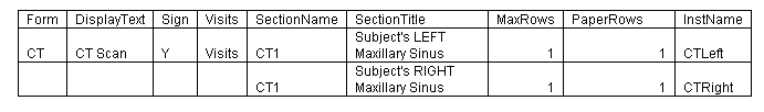 As you see column Form has an abbreviated name this is only used for Data management and does not show up on the paper forms, but is required for the system. Also note that all the rows below the Form text are blank in this column. That means all the rows belong to this form, when you want to create a new form you will add another name in this field. The DisplayText is actually what is shown on the form. This form does not require a signature and there are no required visits. Note: The SectionName is abbreviated and is only for data management and this field is what you would carry over to the Section Tab. SectionTitle is the name of the section that is shown on the form. MaxRows is how many rows you would like the database to have and PaperRows is how many you want on the paper form. InstName is blank which mean these set of questions will not be used on any other forms or sections.