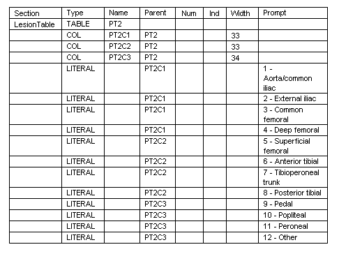 Note: Name and Parent in the sections tab. The Table has a Name of PT2 and the first COL Type has a name of PT2C1 and Parent of PT2. This means each of these columns will be in the same table. Now notice the first Type of LITERAL the Parent is the same as Type COL Name. This example shows the first 4 Target Vessels will go in column 1, the next 4 in column 2 and so on.