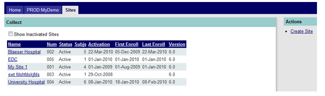 From the site landing page the default view will list all sites enrolled in the study. To create a subject, select the site to which subjects will be added by clicking on the underlined site name shown in Figure 1 below.