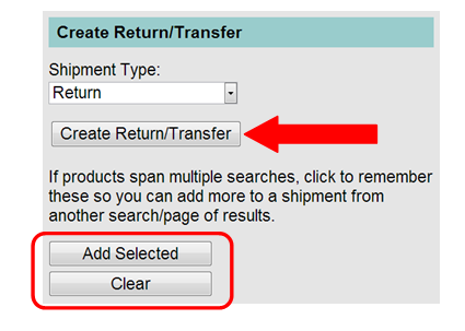 Step 5: When users have completed their product selection(s), click the “Create Return/Transfer” button shown near the red arrow in Figure 5 above.