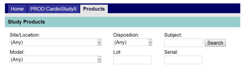 Step 3: The products displayed in Results (with no filters applied) reflects all items in inventory at all sites. To narrow the focus of product results, run one or more filters by typing your selection in the space provided or choosing from the available drop down lists as shown in Figure 3 below. Once you’ve chosen your filters, click on the “Search” button to view the results. The product results will be limited to products reflected by the selected filters. [Note: Any entry in the Lot, Subject or Serial filter fields will produce results that contain the numbers/letters entered. For instance, if users enter a “3” in Lot, the results could contain all records that contain a “3” (e.g. “1300”, “H-342”, “33” etc.) Using multiple filters will more narrowly focus the results.]