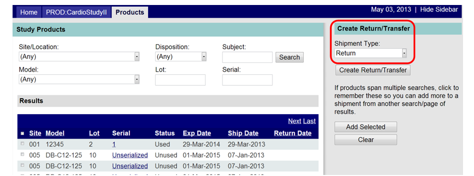 Step 2: The Products landing page displays products in inventory at sites. In the Create Return/Transfer side bar, the Shipment Type default value displays “Return” as shown in Figure 2 below. Leave this value as “Return”.