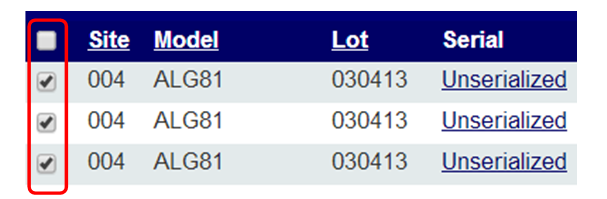 Step 4: Select the product(s) being returned by clicking on the checkbox next to the product(s) as shown in Figure 4 below. Clicking on the very top check box (displayed in the solid menu bar) selects all items currently visible in the results on that page. Users may return as many products as are displayed/filtered, reflecting products that are currently in inventory at a site. If the products extend beyond the visible results to additional pages, click on the “Add Selected” button before moving to another page. To clear any product selections and to begin afresh, click on the “Clear” button. See Figure 5 below.