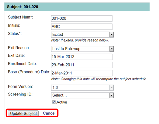 To change the Status (from the default of “Active”) select from the choice(s) in drop down list. Marking a subject as “Exited” does not delete the subject or their data, and you may make them “Active” once again at a later date. (*Required field) |