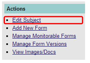 Once in the subject landing page, click on Edit Subject in the sidebar on the right side of the screen under Actions (see Figure 2 below) to edit the record as appropriate.