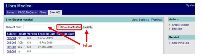 From the site landing page, you will see a list of subjects already associated with the site as shown in Figure 1 below. To edit subject data, click on the subject number which contains a hyperlink to navigate to that subject’s list of CRFs. (You may also use the filter to more narrowly focus your search by typing in the subject number then clicking the “Search” button as shown in the first figure below.)