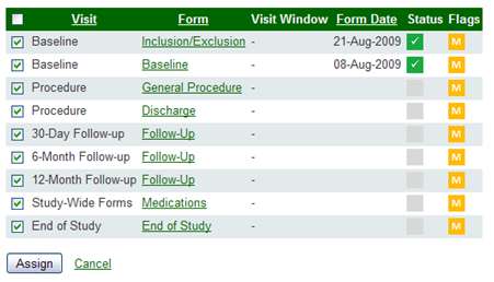 You will navigate to the screen shown in Figure 2 below where you will select the CRFs that need to be identified for monitoring by clicking on the box/es to the far left of a particular CRF. Once CRFs are marked for monitoring, click on the “Assign” button at the bottom of the page. The “M” flag will change in color from gray to yellow.