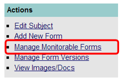 The “Monitored” flag is used to indicate that a CRF should be monitored. To mark a CRF or group of CRFs for monitoring, from the Subject Landing Page select the “Manage Monitorable Forms” link in the Actions sidebar. Refer to Figure 1 below.
