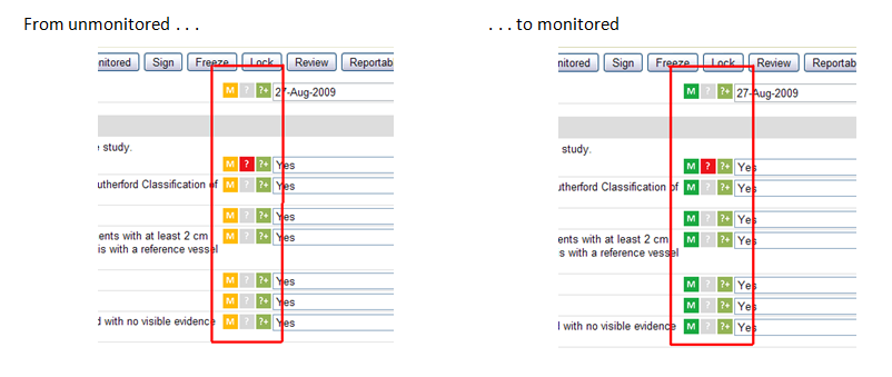 Once data has been monitored, there are two ways the monitor can mark the CRF (or only certain data points on that form) from within the CRF: 1) Click “Monitored” in the menu bar at the top of the CRF (see Figure 3 below) if the entire CRF has been monitored; or 2) Click on the “M” icon next to the data point/s monitored (see Figure 4 below). Either of these actions will change the flags from yellow to green.