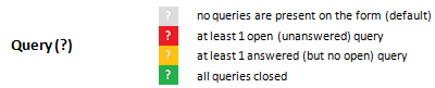 When data is entered into Maestro CRFs, non-conforming or missing data may trigger built-in queries and appear as question marks next to the data point(s) within the CRF or on the subject landing page next to the applicable CRF. These queries are color coded based on the query status. Query form flags are defined below.