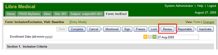 From inside an individual CRF, click on the “Review” button at the top of the page in the menu bar to mark a CRF as reviewed. See Figure 1 below. This will change the “D” flag on the Subject Landing Page from gray or yellow to green and the “Review” button to “Unreview”. To reverse the step, click “Unreview.”