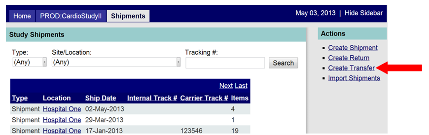 Step 1: From the Study landing page, click on Shipments in the Product Tracking module. Click on the Create Transfer link located in the sidebar of the Shipments screen as shown in Figure 1 below.