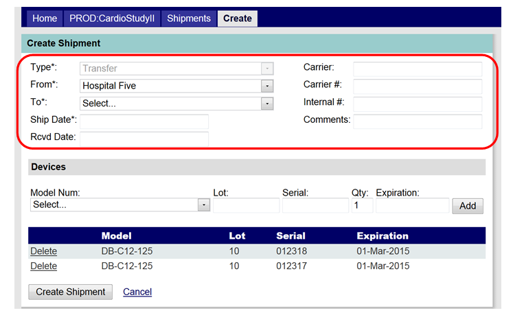 Step 5: You will navigate to the Create Shipment page where you should complete at minimum, the required (*starred) fields. The devices have already been selected, so the final step is to click on “Create Shipment” to complete the transfer. See Figure 5 below.