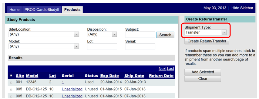 Step 1: From the Study landing page, click on Products in the Product Tracking module. The Products landing page displays products in inventory at sites. In the Create Return/Transfer side bar, the Shipment Type default value displays “Return’; change the value to “Transfer” as shown in Figure 1 below.