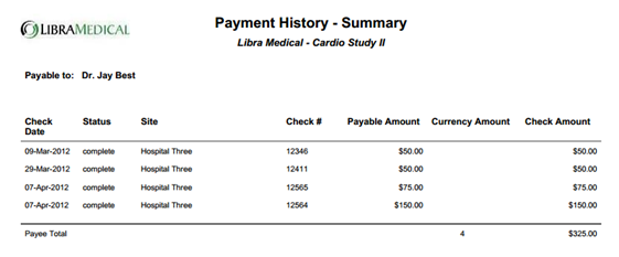 The Payment History–Summary Report generates a summary of all payments (by payee) generated in the study. See Figure 2 below. To see a payment history for a single payee, run this report from the Contacts page.