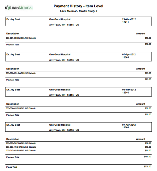 The Payment History–Item Level Report generates an itemization of all payments (by payee) generated in the study. See Figure 3 below. To see the report for a single payee, run from the Contacts page.
