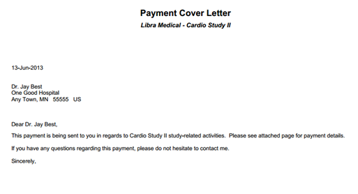 The Payment Cover Letter (as shown in Figure 2 below) is typically printed and sent with the payment and Payment Details Report, since there is a reference to it in the letter. This is non-editable, though a signature is expected and hand written notes may be added.