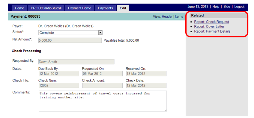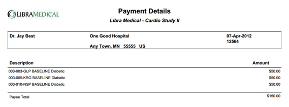 The Payment Details report (as shown in Figure 3 below) itemizes the payment by providing details of all payable items being combined into this payment. It includes subject info (e.g. subject ID, subject initials, interval and CRF) and the check number and date of the check (if printed after this information has been entered into the database). This report could also be used to provide detail to the payor of payable items associated with this payment.