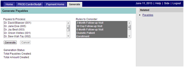 Step 3: Click the “Generate” button to process payables, or click on a tab at the top of the page to move to a different task without generating payments. (Note: Processing the data could take some time, depending on the size of your study. To stop the generation of payables after the process has begun, click the “Cancel” button.)