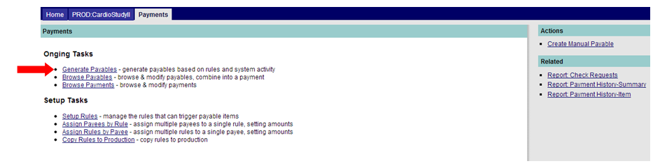 To generate payables, follow the steps below. Payables may be generated in MAESTRO at any time frame during the study, as directed by study protocol or other guidance documents.
