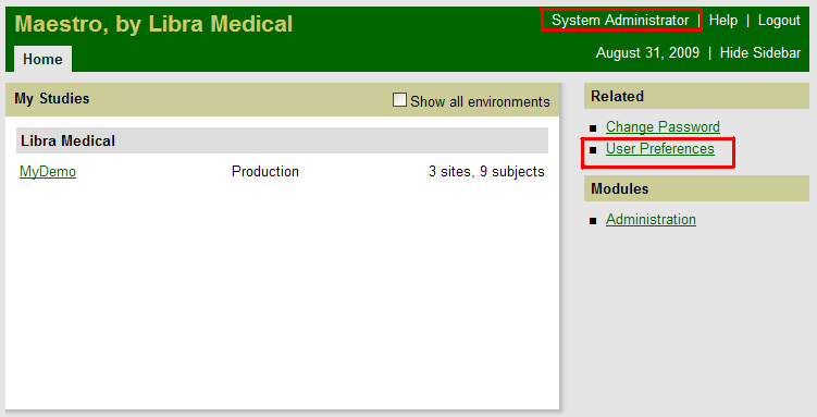 To get to the User Preferences page, you may do either of the following: click on the User Preferences link or your name which will appear as highlighted in the picture below..