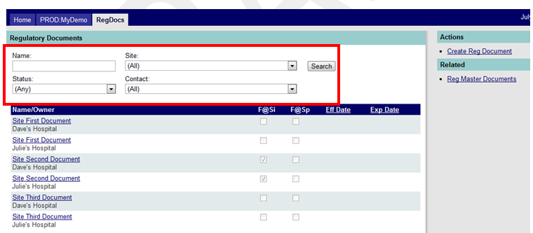 There are a variety of filters available which can more narrowly focus the subset of documents you wish to view: by name, status, site or contact. From the Documents screen, choose your filter(s) and click on the Search button. Or choose to apply no filters to view all documents affiliated with the study. See Figure 13 below.