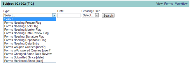 - Select the type of workflow query you wish to run as shown in Figure 3 below. If the type choice is followed by [user] or [date], make a selection from the “Creating User” dropdown box or enter the date in the “Date” field shown as applicable.